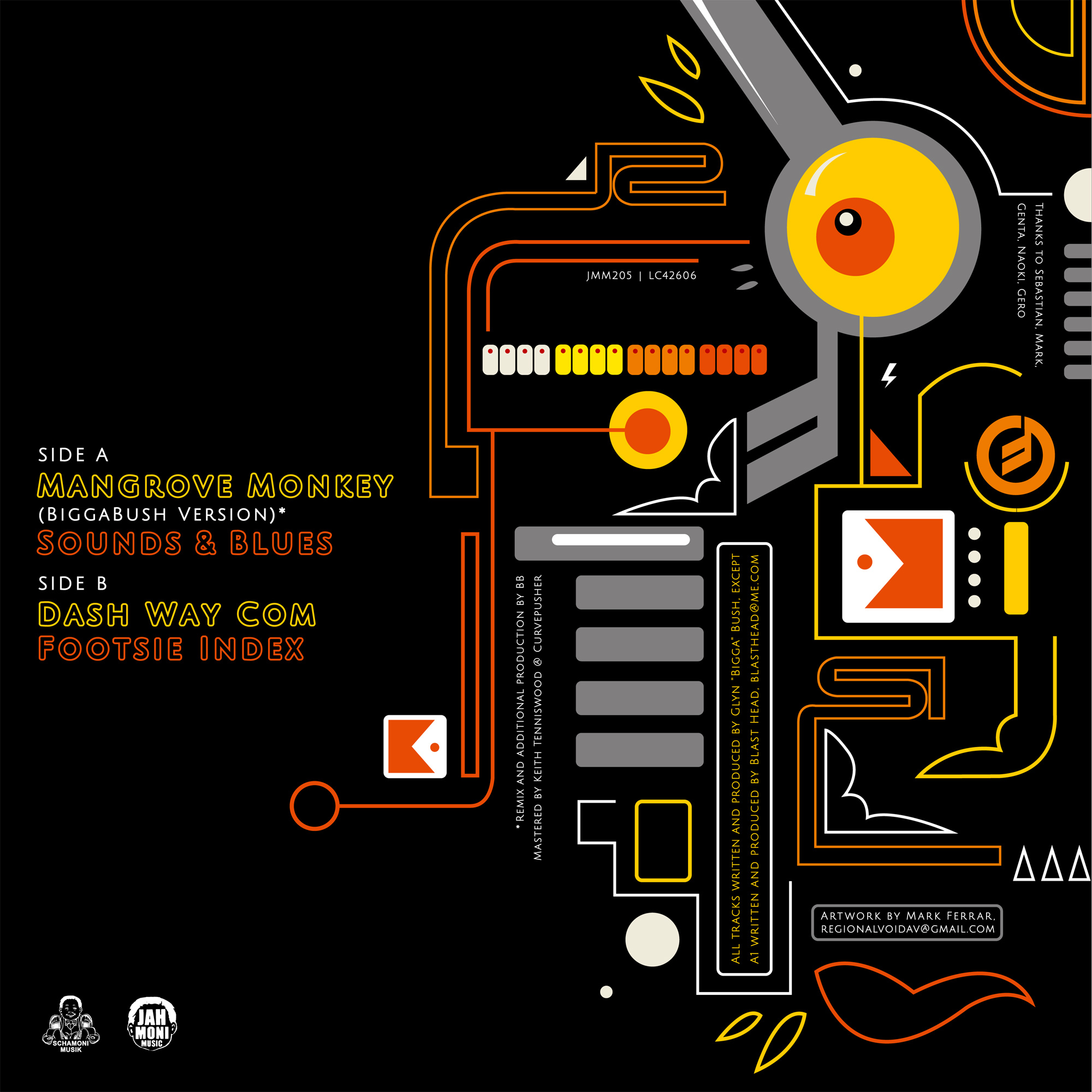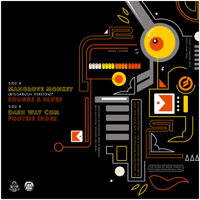 This EP is his first vinyl release since the late 00s and takes in a number of bass-heavy rumblers with classic BiggaBush twists and turns, starting with the steppas delight of Mangrove Monkey, relentless subs and skanks of Sounds & Blues, post-dubstep breaks on Dash Way Com and finishing with a minimal 4/4 FX soundscape on Footsie Index.